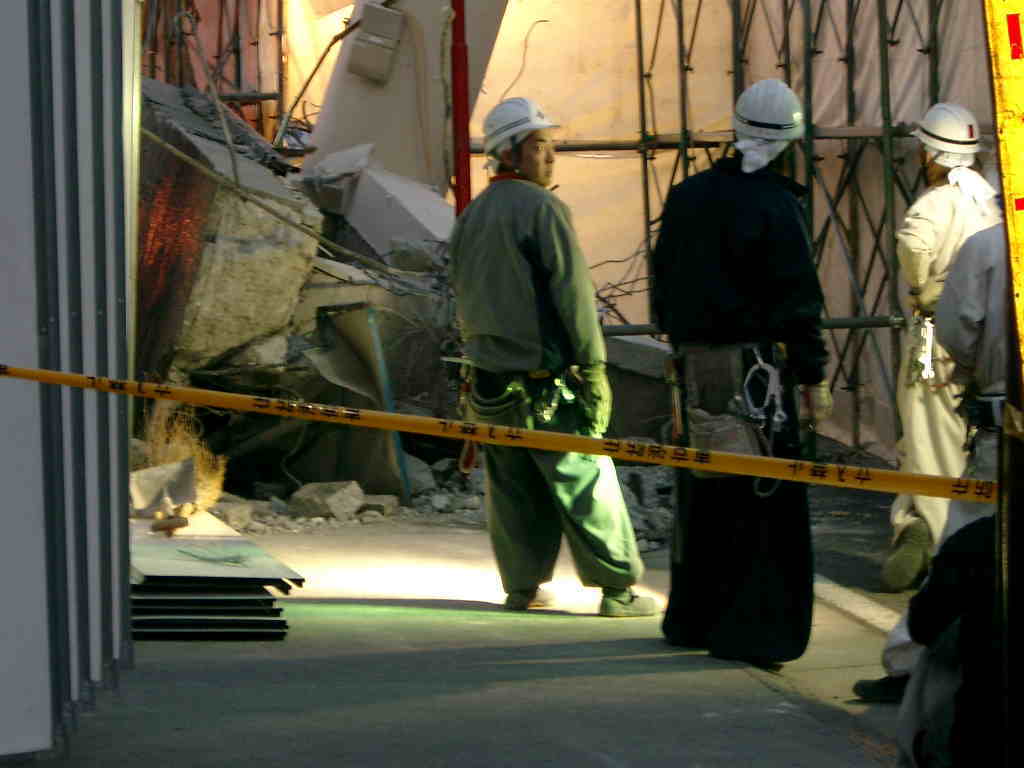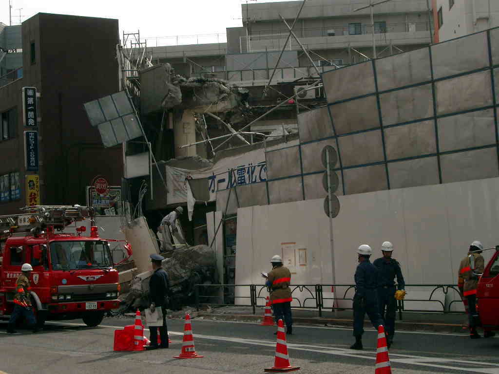 解体中のビル崩壊(2004.2.28撮影) 2004年2月28日 解体作業中の旧東京電力のビルが突然崩壊した。 クレーンでの解体作業のミスかもしれない。 自転車で通行中の男性がいたが、間一髪で逃れ、けがですんだ 緑色の服を着た作業員の方がいる所が、みんなが歩いていた歩道。 新庁舎建設100人委員会の素案発表会への途中で、遭遇。 幹線道路の一時前面通行止めで、立川市内は大渋滞を引き起こした。 自転車でよかった・・・・。 ▲フォトギャラリートップへ