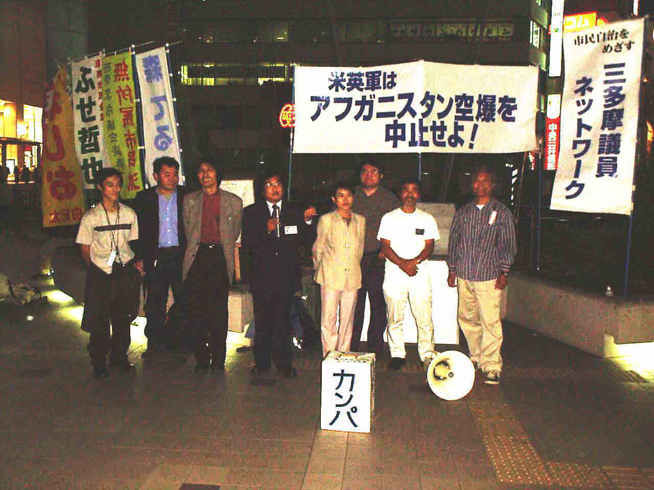 議員ネットではアメリカ・イギリス軍によるアフガニスタンへの空爆に反対する行動をしようと決めました。そして日本が自衛隊を海外派兵することではなく、日本国憲法の理念に沿って国際紛争を解決する手段として戦争ではなく、相互信頼と話し合いで解決することを求めようと、情宣活動を行いました。