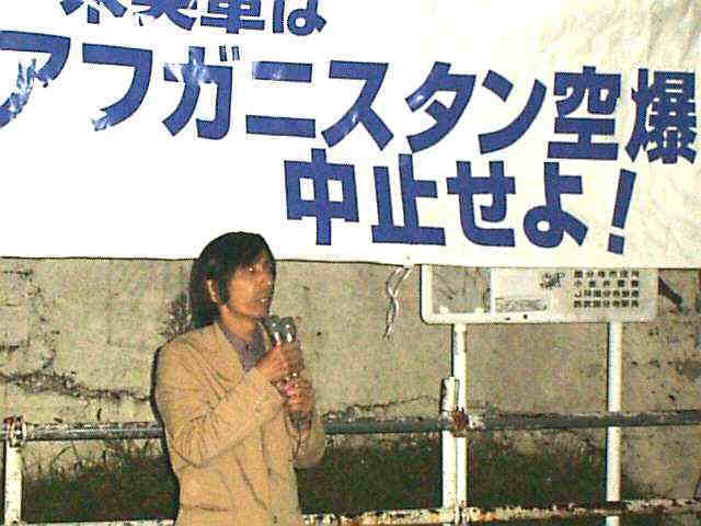 マイクで話す大沢 国分寺駅でビラ配り