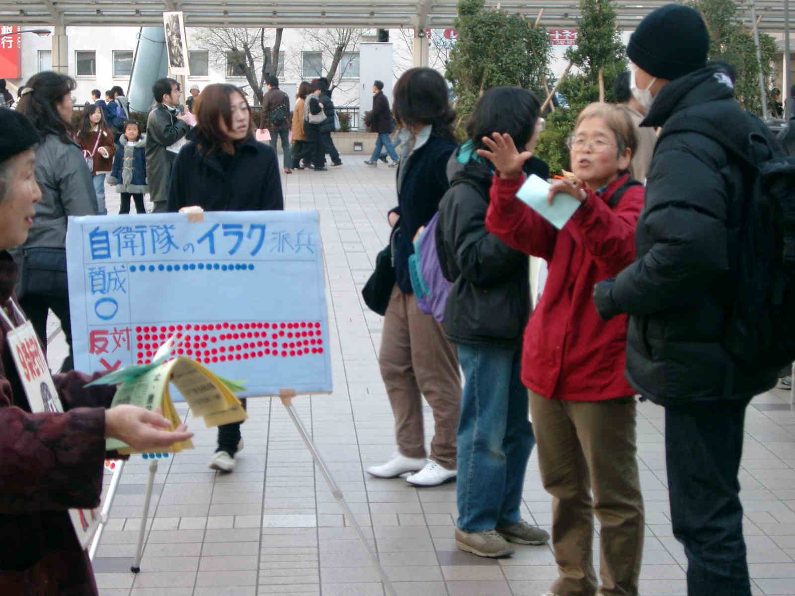 だからこそアメリカに追従することではなく、私たちが世界に誇る平和憲法を世界中の憲法の見本として広げていくことが必要です。いまこそ、平和のための声をあげましょう。自衛隊の隊員が「アメリカの軍需産業の利潤」のために命を落とすことなく、またイラクの人々を殺したり傷つけたりすることの無いように。(2004.2.1)