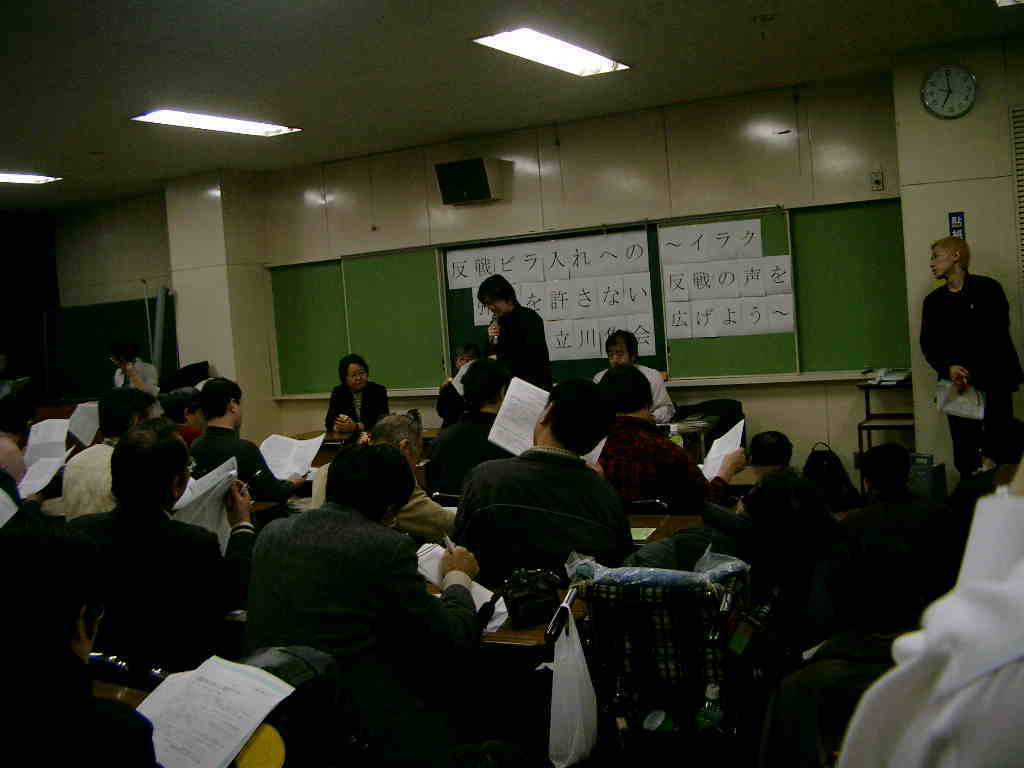その後、会場からの発言で、イラク戦争に反対し、平日昼間アメリカ大使館前で抗議を続ける、ブルキッチ加奈子さんに対する赤坂警察署の弾圧の様子やが報告され、ました。他にも運動体や個人からの発言が続きました.