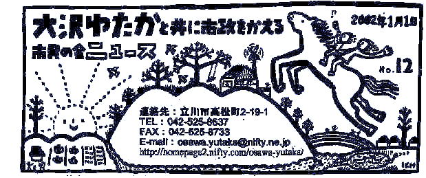 石原都知事、小泉首相、ブッシュ大統領、圧倒的な人気を背景に、むちゃくちゃな論理で国家主義的政策を推進するこれらの指導者にわれわれはどう対抗していかなければならないのか・・・・ 大沢さんには、きちっと市議会で声を上げてもらわなければならないし、私達も、それぞれの場できちっと異議申し立てをしていかなければならないと思う。