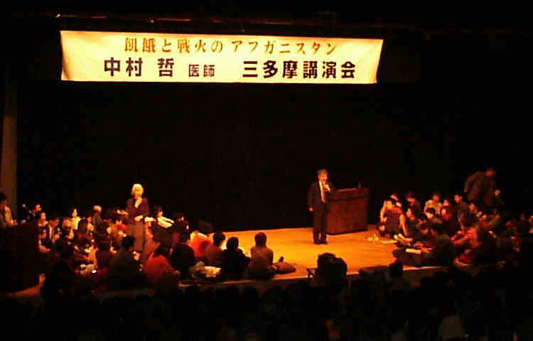 ペシャワール会 中村哲医師の講演会 12月4日(in武蔵野公会堂)700名の参加で聴衆は、舞台にも上がり、会場を溢れ、ロビーにテレビを出して聞き入るという大盛況でした。中村医師のこれまでの17年間のアフガニスタンでの活動や最新情報、日本国内でのマスコミ報道のウソや恣意的な報道に腹を立ていることなどを、熱心に話されました。